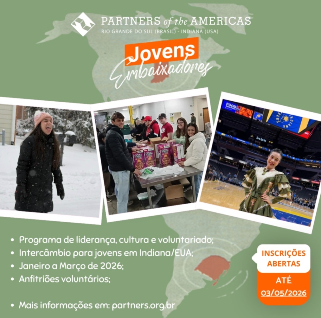 Estão abertas as inscrições para o Programa Jovens Embaixadores 2027 do Partners of the Americas RS/IN — uma oportunidade única para jovens que desejam viver uma experiência internacional transformadora, desenvolver liderança e atuar em projetos de voluntariado.
